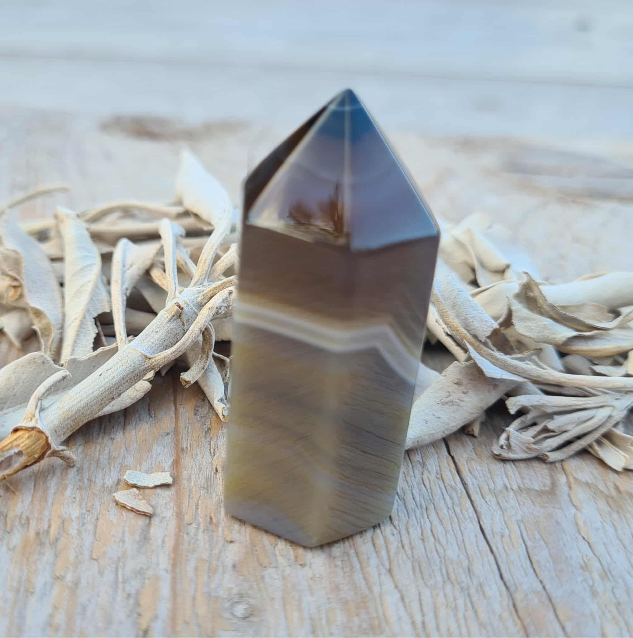 Agaat werkt aardend, stabiliserend en beschermend en heeft een kalmerende en balancerende eigenschappen. Met Agaat vind je geestelijke en emotionele rust waardoor je weer bij jezelf kunt komen. Agaat laat je zelfvertrouwen groeien en stimuleert je concentratie. Deze steen laat je objectiever naar de dingen kijken, hierdoor kom je tot praktische oplossingen bij uitdagingen die je tegenkomt. Doelen stellen om aan jezelf te werken worden makkelijker uitvoerbaar door de Agaat, hierdoor stimuleert het persoonlijke groei en ontwikkeling.