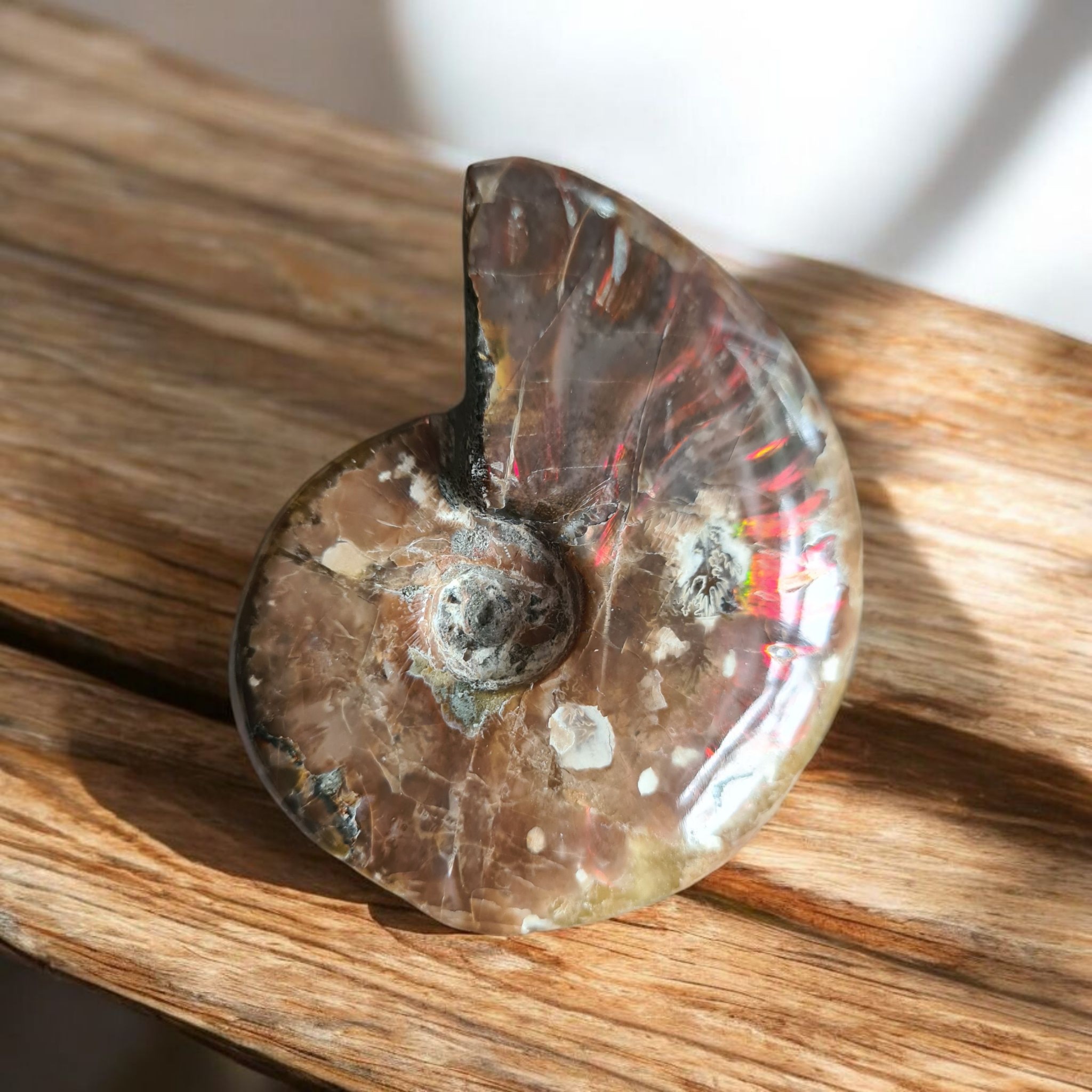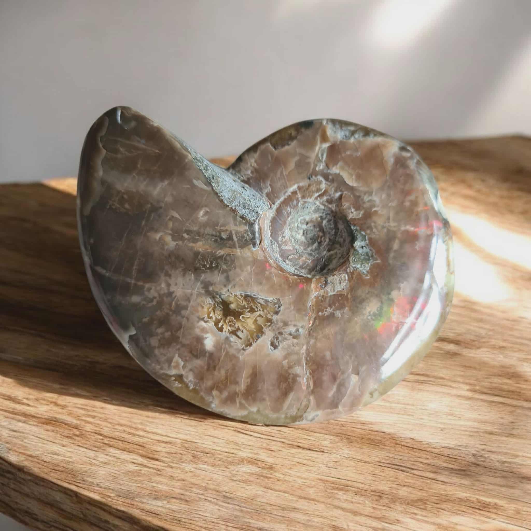 Ammonieten zijn iriserend, soms wittig met groenige glans of bruin met een rode gloed. Ammoliet activeert metafysische krachten en interdimensionaal onderzoek. Hij is vooral effectief op de somachakra(haarlijn) en het 3e oog. Hij staat voor het voltooien van een cirkel en een eerste verkenning van een plaats.