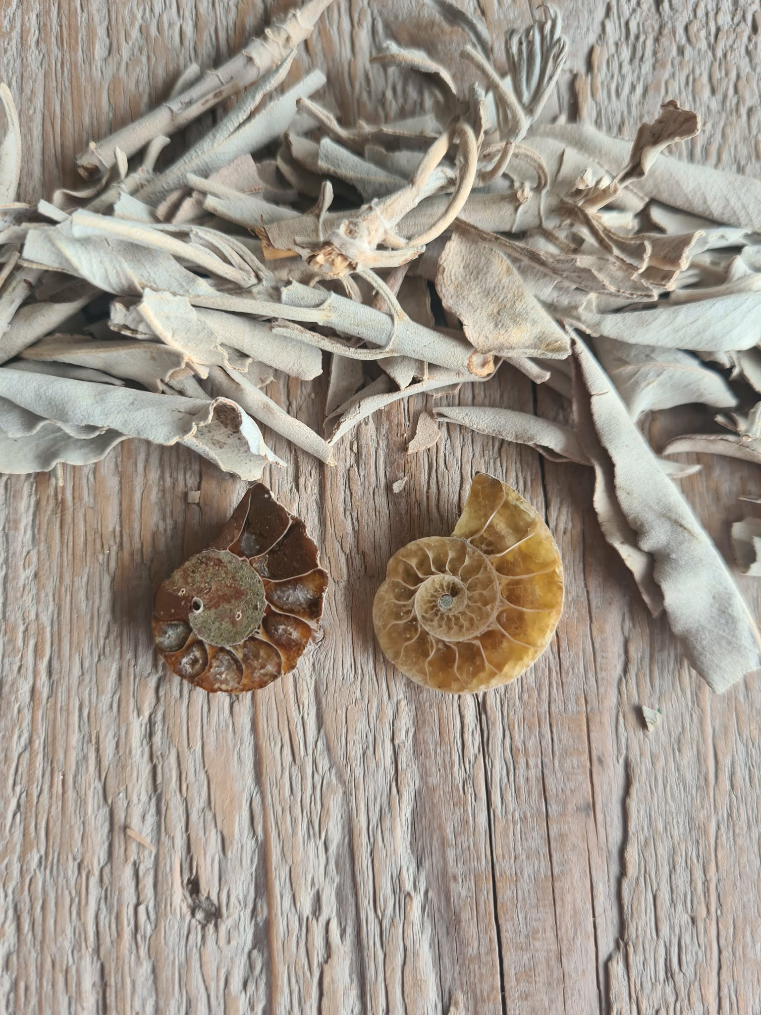 Ammonieten zijn steenfossielen van een soort inktvissen die zo’n 65 miljoen jaar geleden zijn uitgestorven. Ammoniet is een zeer aardend en krachtig fossiel. Het fossiel staat bekend om het absorberen van negatieve energie. Zijn spiralen zijn een soort filter, waarmee hij dichte, zwaar geworden energieën naar binnen trekt. Vervolgens beweegt de energie door de spiralen en komt weer vrij als frisse, positieve en liefhebbende energieën. Mede dankzij deze eigenschap biedt de steen verlichting bij depressie. Daarnaast werkt ammoniet vitaliserend en geeft helderheid.