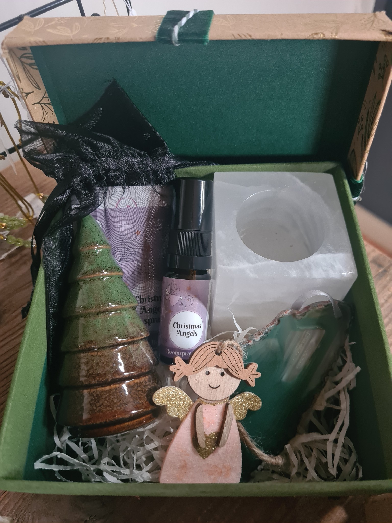 Deze leuke cadeau box bevat: Een wit Onyx waxinelichtKerstornament Agaat (groen)Christmas Angel sprayKeramiek kerstboompje