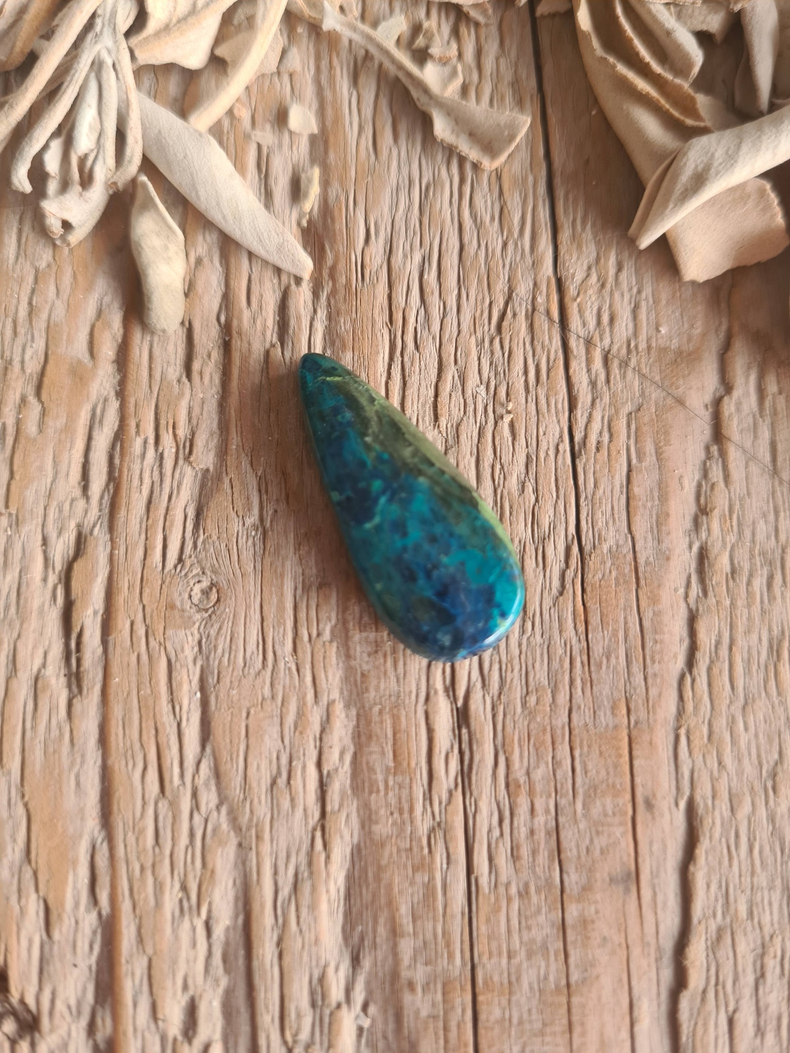 Deze Chrysocolla is plat aan de achterzijde waardoor deze edelsteen zeer geschikt is om zelf sieraden mee te maken