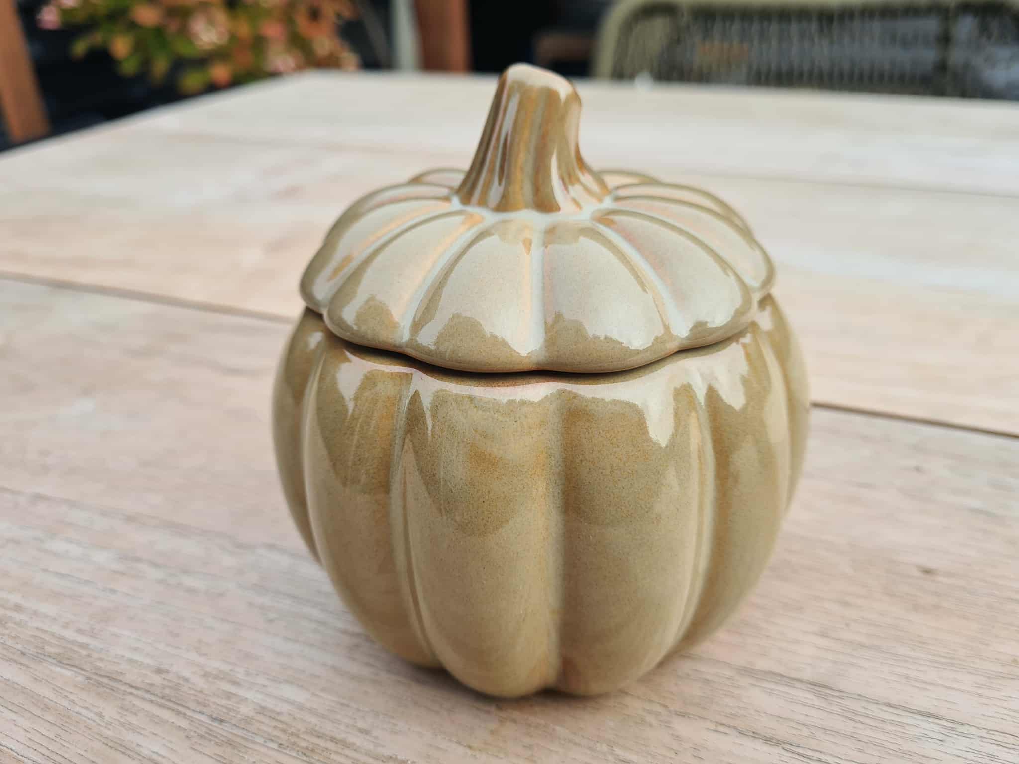 Een stenen pot in de vorm van een pompoen. Gevuld met een heerlijke herfst geurkaars, versierd met Rode Jaspis. Verkrijgbaar in 3 verschillende kleuren, bruin, beige en grijzig.