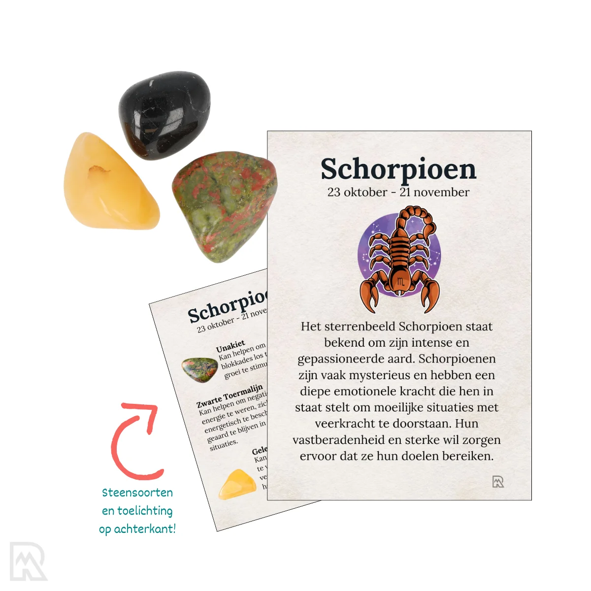 Een kant en klaar cadeauzakje met toelichtende tekst over het sterrenbeeld, Schorpioen. Er zijn drie bijbehorende trommelstenen aanwezig, natuurlijk in de kwaliteit die je van mij gewend bent. De trommelstenen zijn ongeveer 2 tot 3 cm. Het kaartje is geprint in kleur, a7 formaat. Het kaartje is voorzien van een korte toelichting over het sterrenbeeld en welke trommelstenen zijn inbegrepen. Dit alles wordt geleverd in een cellofaan zakje met plakstrip van circa 9×11 cm.