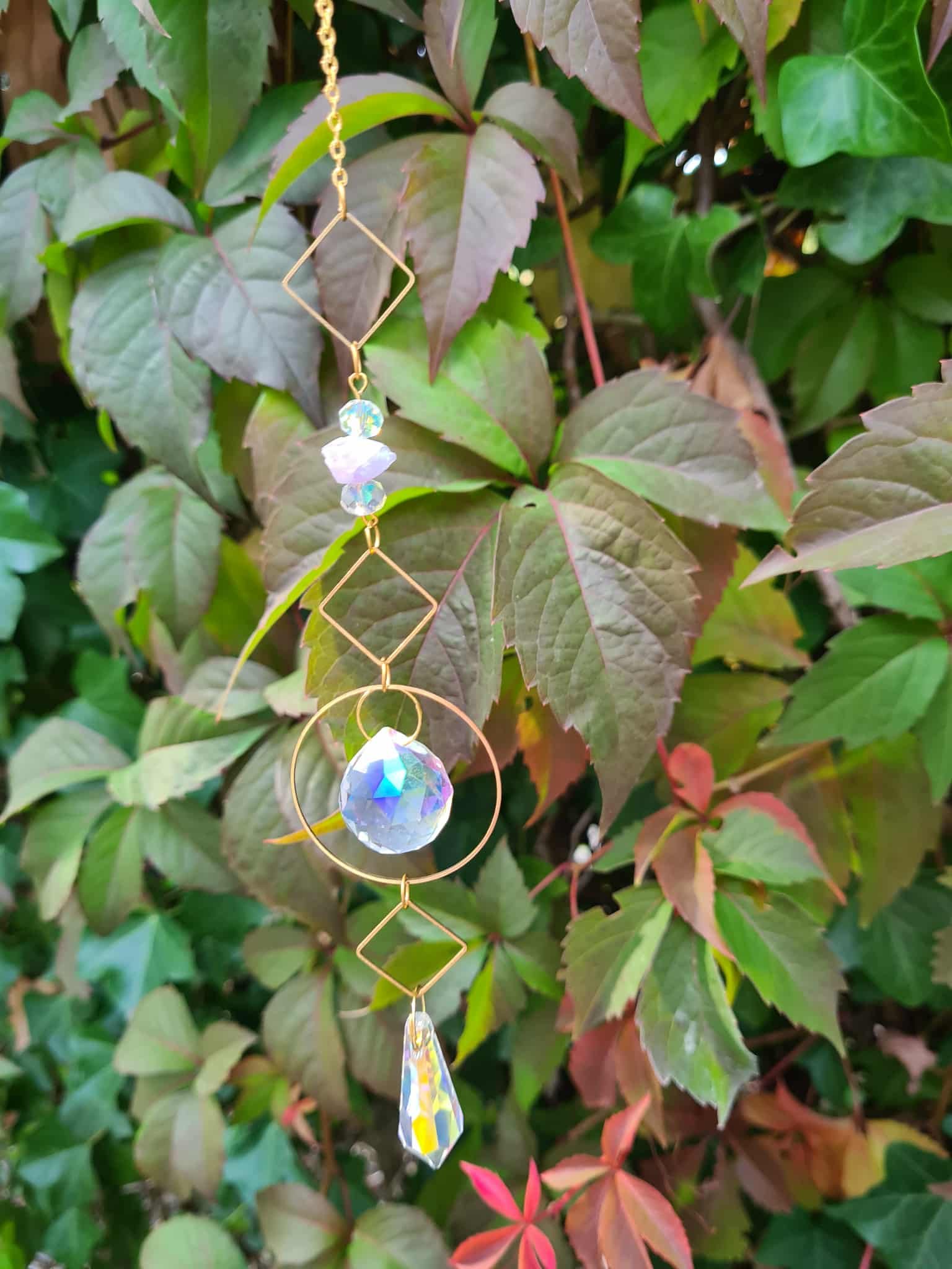 Suncatcher met 2 vierhoekjes en een cirkel. Wanneer de suncatcher in direct zonlicht of in de buurt van een fel licht wordt geplaatst, verspreidt hij dat licht in regenbogen en lichtvlekjes die zich door de ruimte verspreiden.