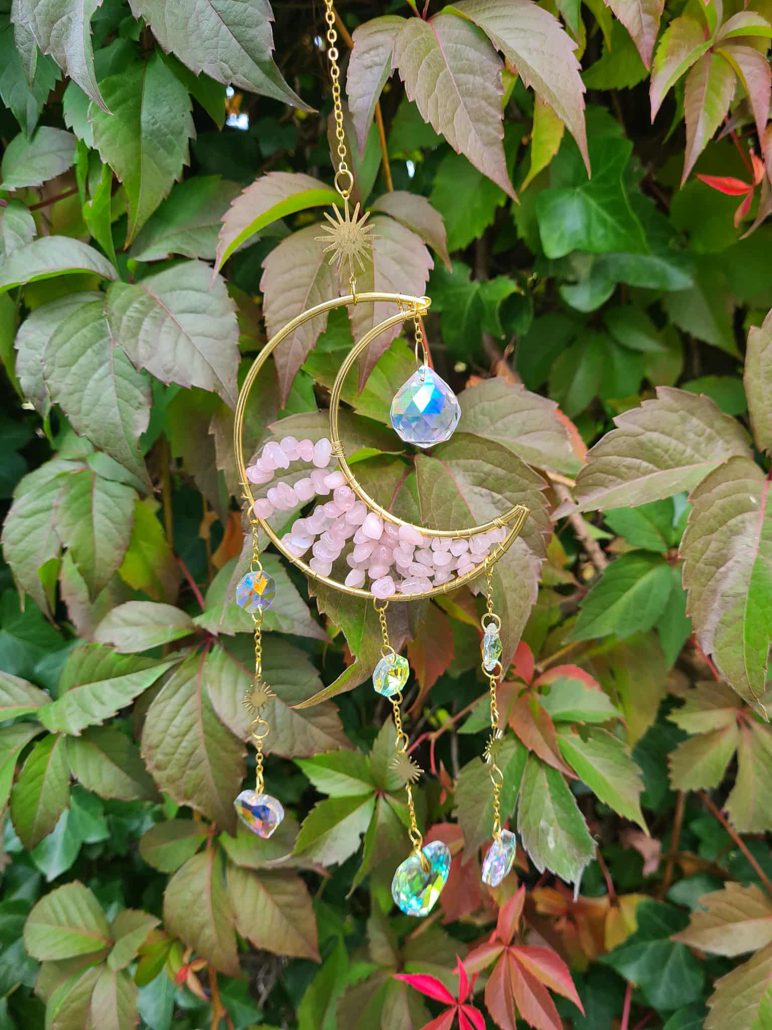 Word je graag betoverd door de magie van de maan? Dan is deze Suncatcher Rozenkwarts iets voor jou. Wanneer de suncatcher in direct zonlicht of in de buurt van fel licht wordt geplaatst, verspreidt hij dat licht in kleurrijke regenbogen en lichtvlekjes die zich door de ruimte verspreiden. Daarom wordt een suncatcher ook wel ‘regenboogmaker’ genoemd. Deze Suncatcher met Rozenkwarts edelstenen en K9 kristalglas kralen kan de energie van het zonlicht vangen en daarmee een donkere ruimte magisch oplichten. Rozenkwarts is de steen van het hart en de liefde. Het opent je hart om liefde te ontvangen en om liefde te geven. Daarnaast bevordert deze prachtige edelsteen zelfacceptatie en leert het je weer opnieuw van jezelf te houden. Rozenkwarts helpt ook goed tegen angsten.